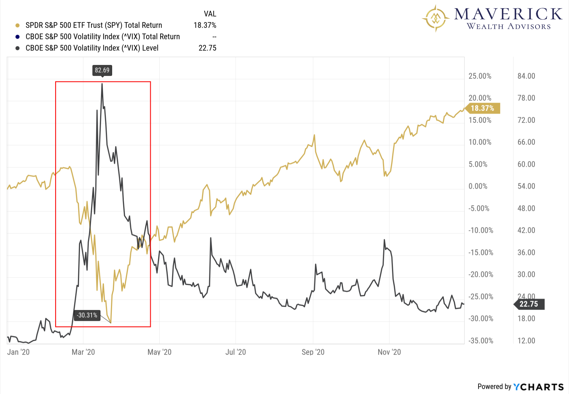We also saw extreme volatility during the 2020 Coronavirus Pandemic. This time, lockdowns created great uncertainty for the future, with panic spreading worldwide. On February 19th, 2020, the SPY returned 5.12% for the year before tumbling due to growing uncertainty. The market bottomed out on March 23rd, 2020, down 30.31% for the year, while the VIX hit 82.69 on March 16th, 2020. The S&P rallied for the year after this sharp drop to finish up 18.37% for 2020. This reflected a major change in market sentiment after news of stimulus payments helped spur the economy during this time.