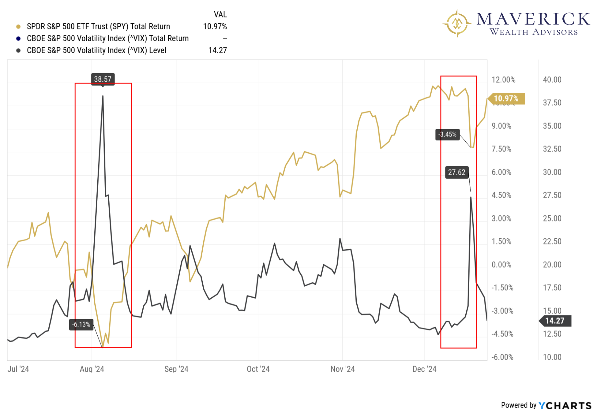 In recent history there have been occasions where we can analyze the relationship between market sentiment and action in volatility. 2024 had two large volatility spikes resulting in changes in the market. The first was in August, when the bank of Japan raised rates on borrowing their currency. This change triggered a carry-over trade where investors who used the Yen to buy equities closed their positions to avoid the interest that was going to be charged. This led to the VIX hitting 38.57 and the S&P ETF, SPY, dropped 6.13%. While the market rebounded the short-term trend changed to a time of more fear in the market and higher volatility. Later in December, the Federal Reserve announced a rate cut for the national interest rate of 0.25%. While the cut was expected they forecasted that 2025 could see fewer rate cuts to help deal with stickier-than-expected inflation. The market did not take kindly to this news with the VIX rising to 27.62 resulting in a 3.45% drop in the SPY.