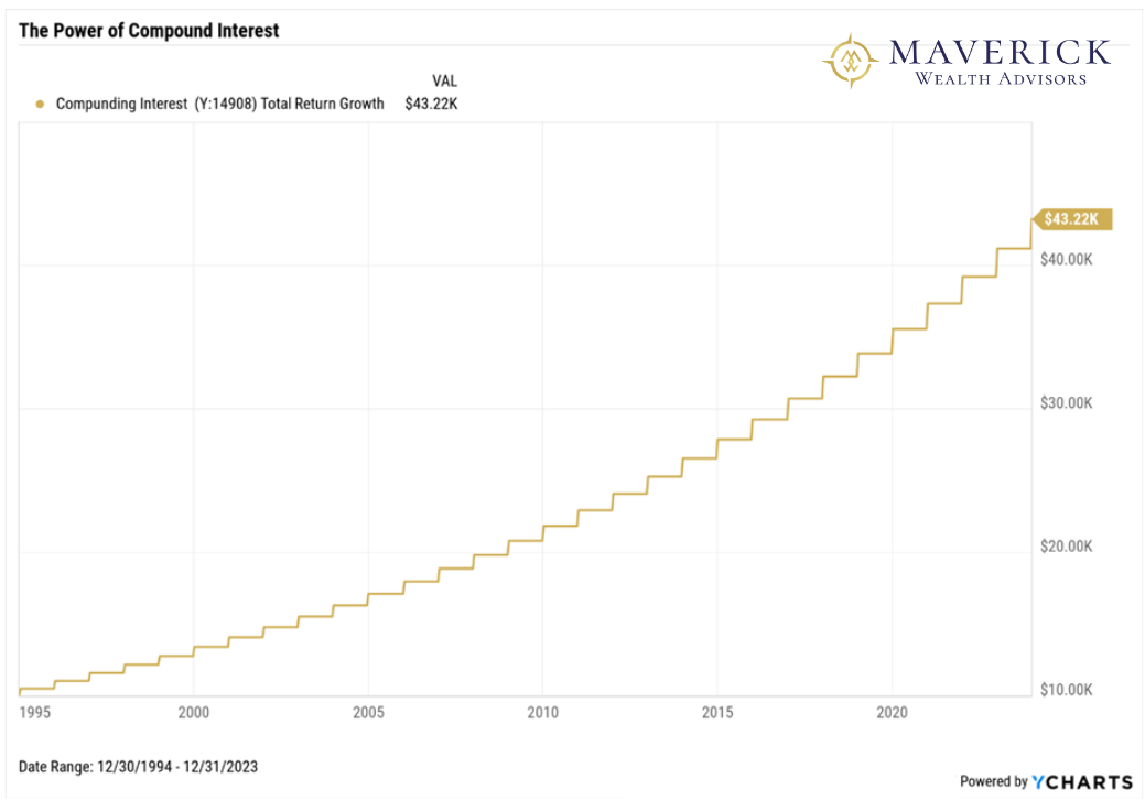 Imagine you invest $10,000 at an annual interest rate of 5% (see the chart below). In the first year, you'd earn $500 in interest, bringing your total to $10,500. However, in the second year, you're not just earning interest on your initial $10,000; you're earning it on the $10,500, resulting in $525 of interest. As time progresses, this cycle continues, and your money grows at an accelerating rate.